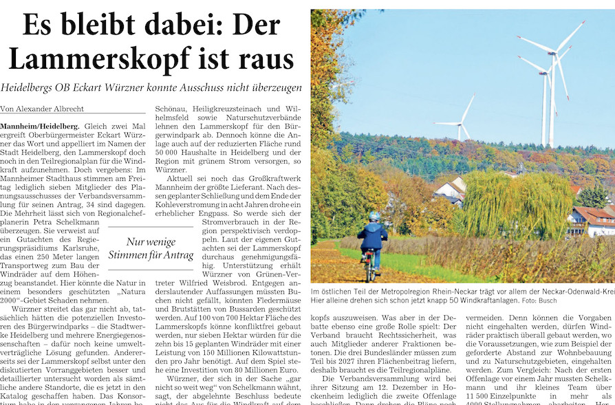 Das Land Baden-Württemberg plant den Bau von 15 WKA, direkt gegenüber von Ziegelhausen und Schlierbach. Ein verheerender Einschnitt in unsere Lebensqualität und die Natur.