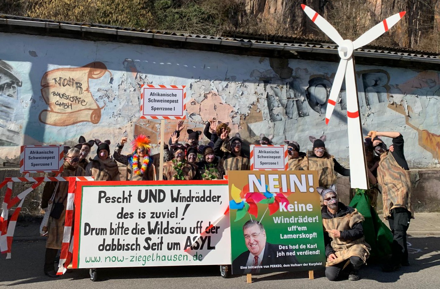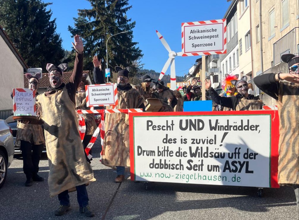 In diesem Jahr stand unsere Faschingsumzugteilnahme in Ziegelhausen unter dem Motto „Pescht UND Windrädder, des is zuviel ! Drum bitte die Wildsäu uff der dabbisch Seit um ASYL.“ Für alle zugezogenen und nicht-dialektfesten Bürger zur Erklärung: Mit der „dabbisch Seit“ ist Schlierbach gemeint !