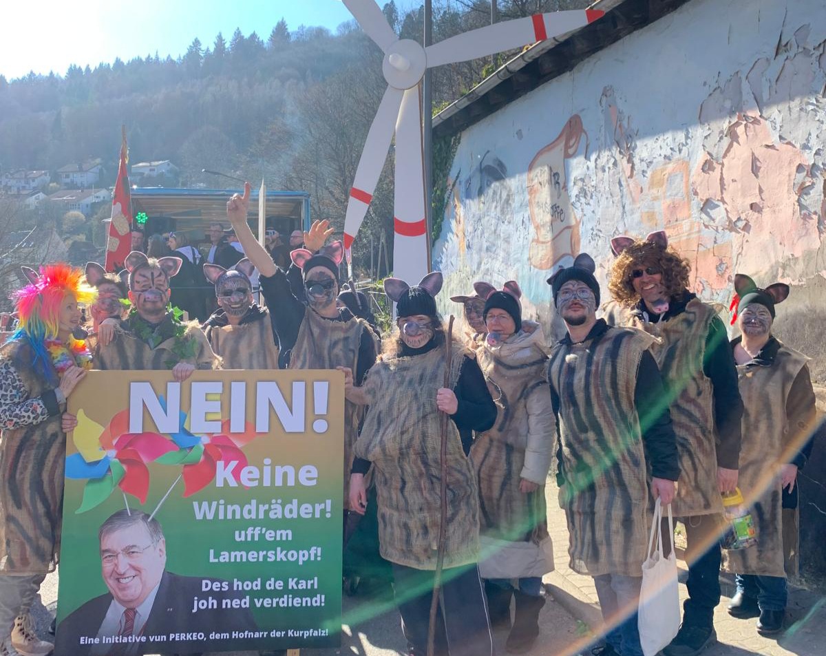 Wir waren wieder ausgestattet mit unserem neu beschrifteten Mottowagen, einem Schild mit der Aufschrift „NEIN ! Keine Windräder ! uff’em Lamerskopf – Des hod de Karl joh ned verdiend !“, was auf unseren Unterstützer Karl Lamers anspielt und unserem bewährten Windkraftrad, das als thematisches Signal aus der Ferne als Neuerung eigenständig mitgeführt wurde. Auch dieses Jahr wurden wir begleitet von unserem Cabriolet, in dem wieder Prof. h. c. Dr. Karl A. Lamers und unsere älteren Mitglieder mitfuhren und somit teilhaben konnten.