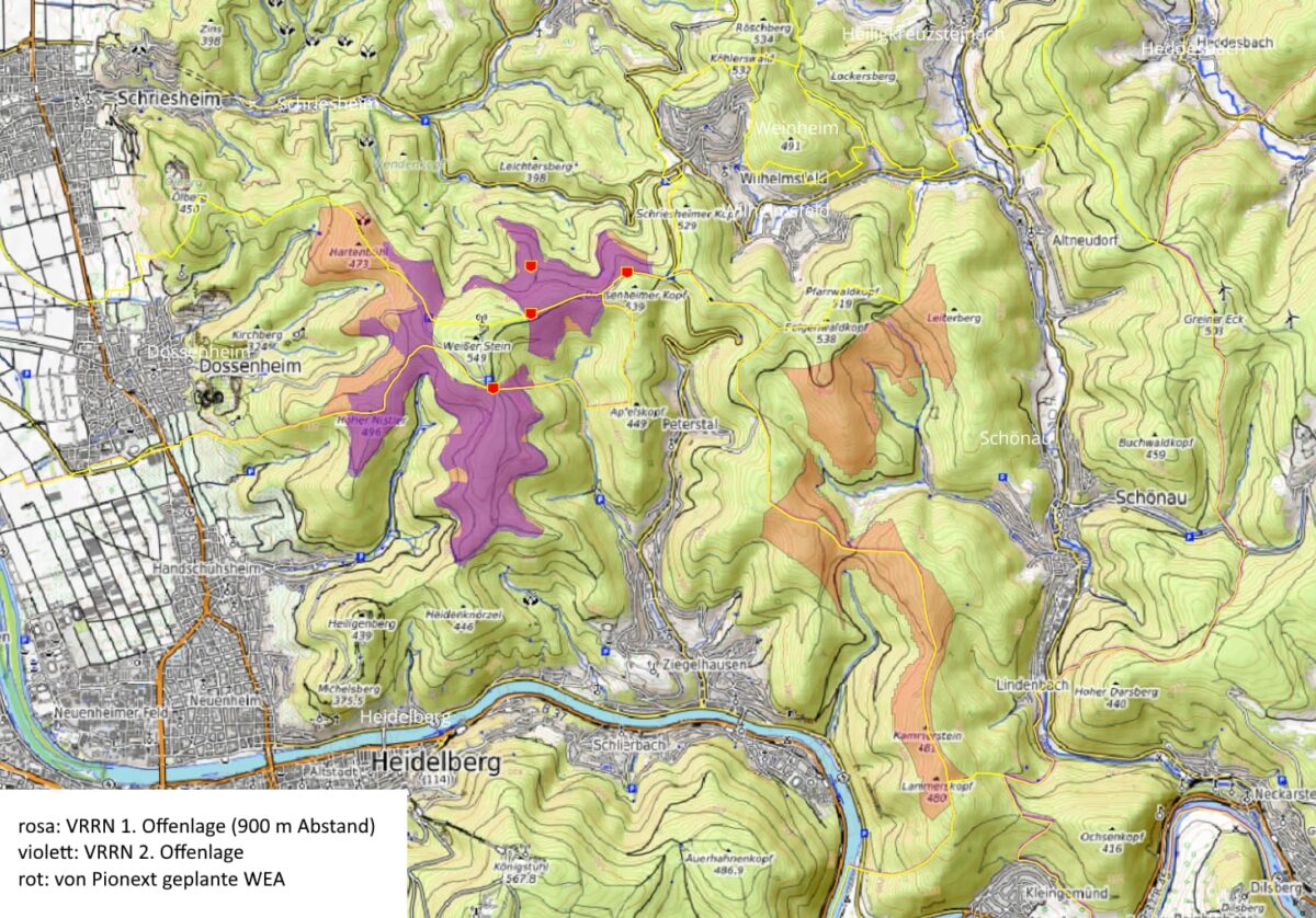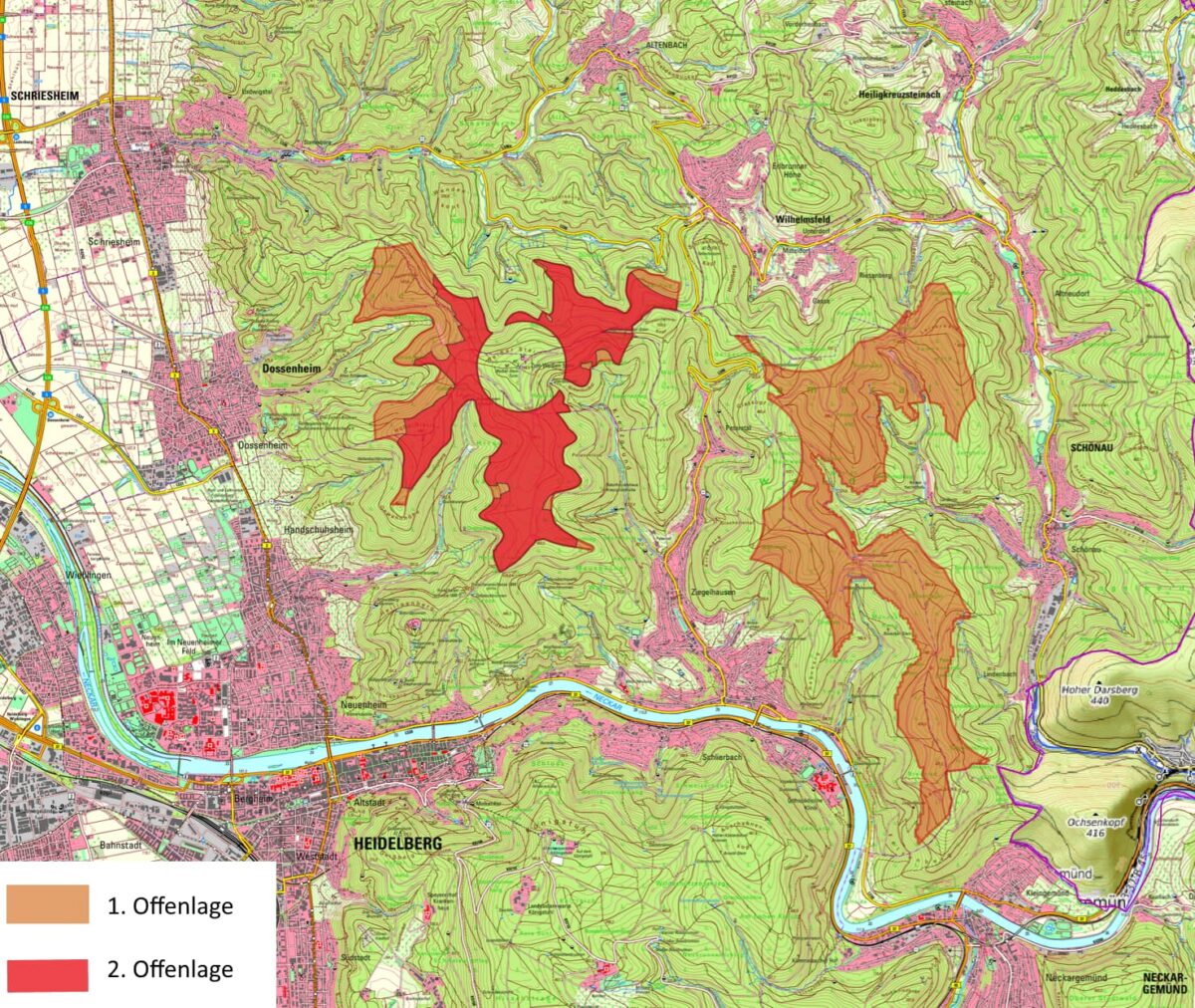 Die Landesregierung strebt die Umsetzung eines umfassenden Klimaschutz-Sofortprogramms an. Ein wesentliches Element dabei ist eine Vermarktungsoffensive von geeigneten Staatswaldstandorten, die die Voraussetzungen für den Bau von bis zu 500 neuen Windkraftanlagen auf Staatswaldflächen schafft. Für die Vermarktung ist in BW der Forst BW zuständig. Aber auch Waldflächen in städtischem Besitz werden für die Planung herangezogen. Die für die Windkraftindustrie ausgewiesenen Flächen sind geschlossene Wälder, die verschiedene Schutzstatuten haben, wie Wasserschutz– oder FFH-Gebiet. Als Fauna-Flora-Habitat-Gebiet ist die Fläche bisher durch EU Recht geschützt. Die Planungsgebiete befinden sich nördlich des Weilers Hasselbacherhof in Schönau, in den Bereichen Münchel und Lärchengarten in der Kammlage und auf Ziegelhäuser Seite rund um die Landmarken Tanzplatz, Pferchel, Peterstaler Sportplatz und Langer Kirschbaum zwischen Heidelberg-Ziegelhausen und Schönau.